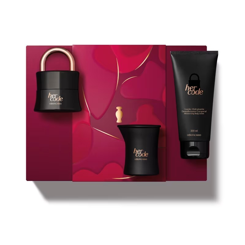 O Kit Presente Her Code vem com dois itens de perfumação e hidratação, além de uma vela de massagem em óleo corporal dessa enigmática linha. Os três itens vêm guardados em uma caixa de presente especial. Um presente mais que especial:
